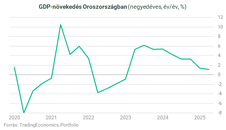 Ez látszik abból, hogy két év kiemelkedő növekedés után – 2023-ban és 2024-ben egyaránt 4,1% – amelyet Moszkva következetesen bizonyítékként emlegetett Vlagyimir Putyin államának „szankciókkal szembeni gazdasági ellenálló képességére”, 2025 közepére a lendület egyértelműen megtört.
