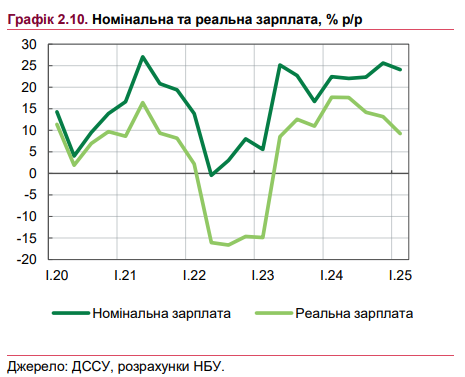 Az NBU arra számít, hogy 2025-ben a nominálbérek 19,0%-kal (az előző áprilisi előrejelzés szerint – 17,70%), a reálbérek pedig 5,2%-kal (3,9%) fognak növekedni.