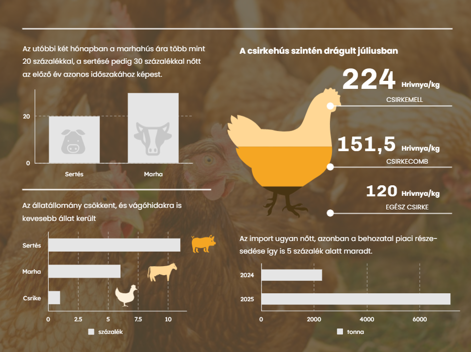 Az idei nyár folyamán jelentős mértékben emelkedtek a húsárak Ukrajnában. Az utóbbi két hónapban szinte minden kategória drágult: a marhahús ára több mint 20 százalékkal, a sertésé pedig 30 százalékkal nőtt az előző év azonos időszakához képest. A csirkehús, amely hagyományosan olcsóbb alternatívának számít, szintén drágább lett. A változások a lakosság mindennapi fogyasztását is közvetlenül érintik.