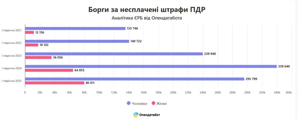 З початку повномасштабної війни зросла не лише кількість несплачених штрафів, а й змінився гендерний розподіл боржників. Частка жінок серед порушників, які не сплатили штрафи, збільшилася з 8% у першому півріччі 2021 року до 21% у 2025 році. Водночас чоловіки віком від 26 до 35 років становлять 41% від загальної кількості проваджень.